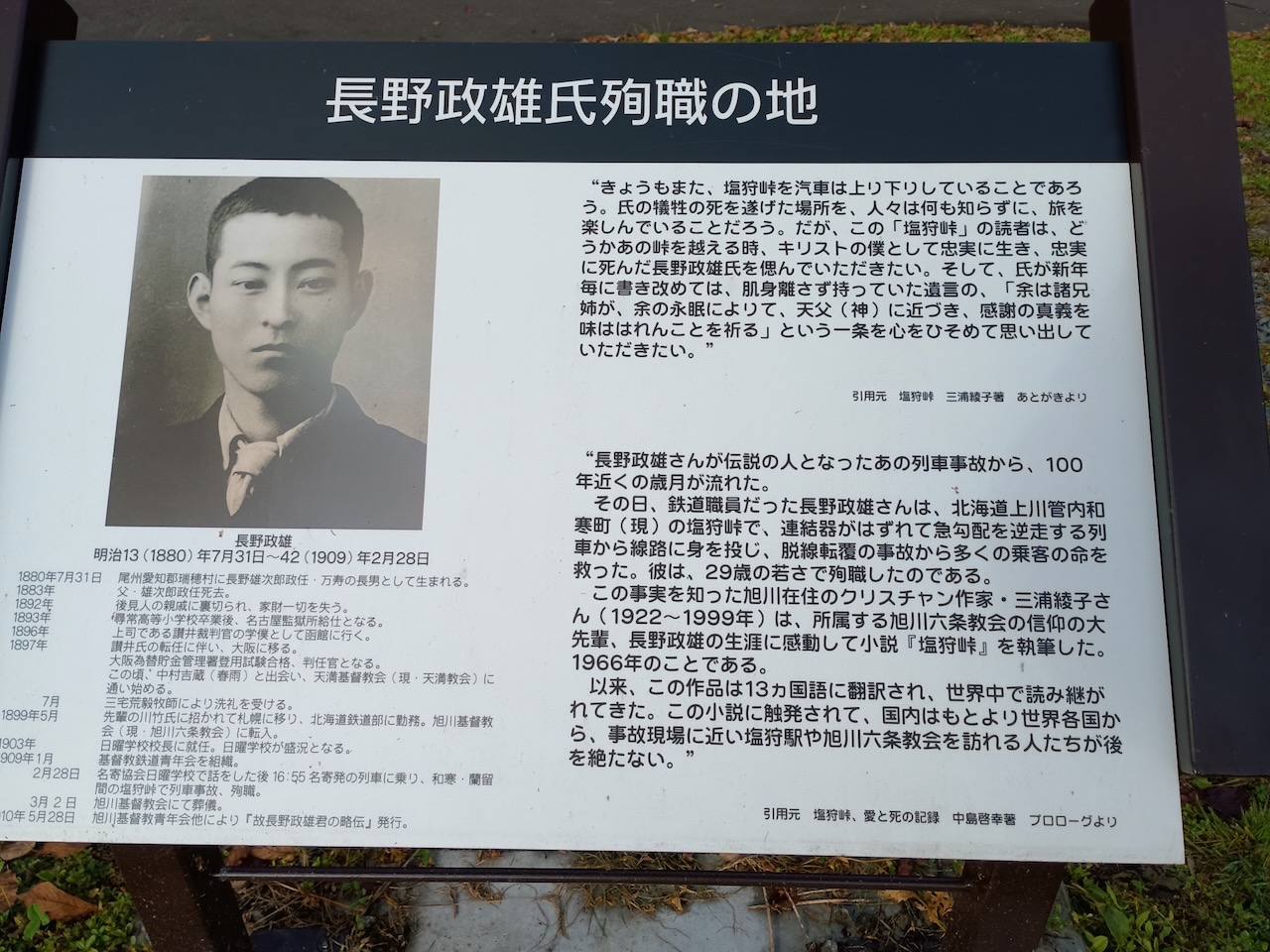 そばには列車事故で亡くなった長野政雄氏の碑がある。