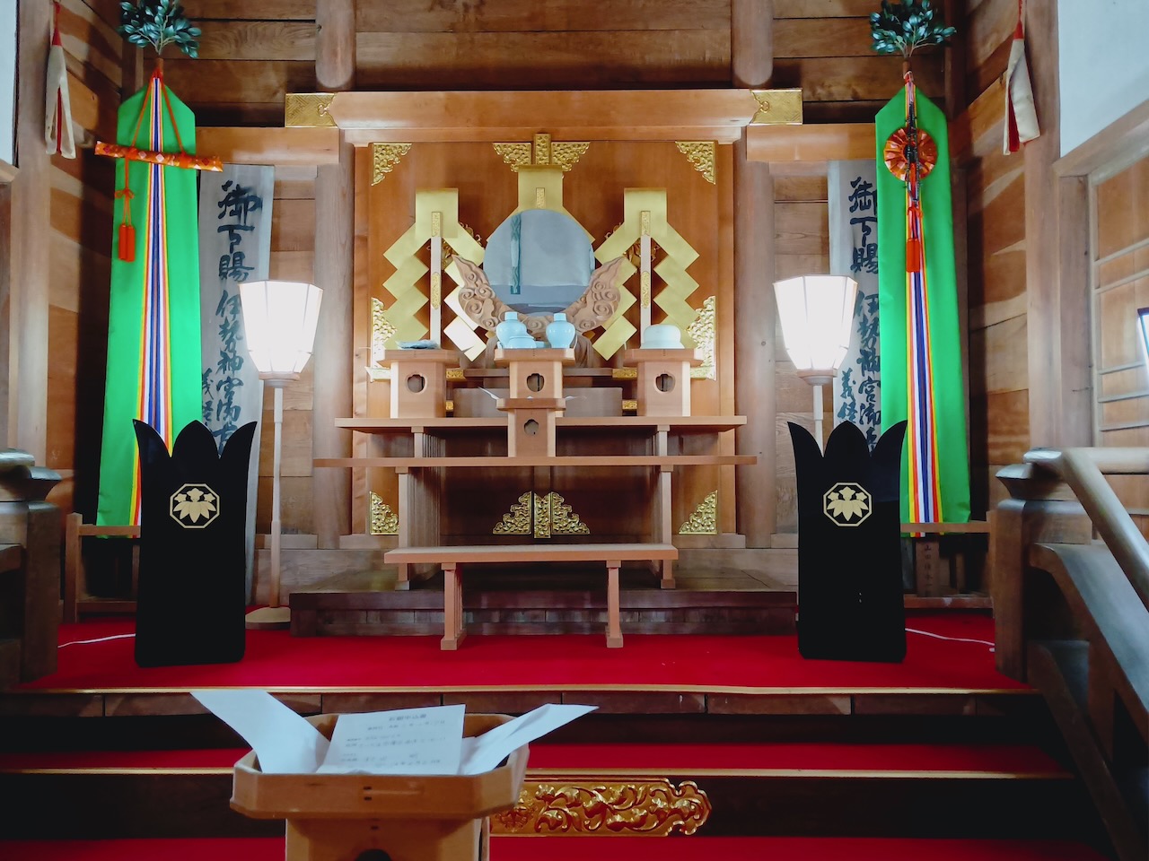 御神体は義経像のはずだが、祭壇には鏡が置かれている。