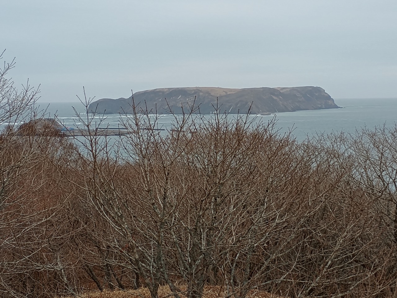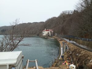 行ってみたら朽ちた道が海岸まで下っていて、下に何か建物が見える。