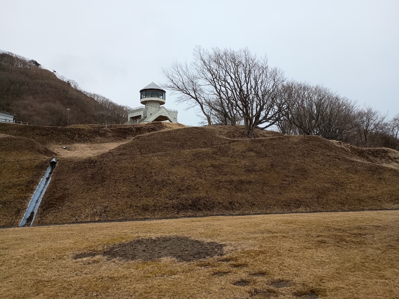 駐車場から展望台が見えるが、舗装道路はこの反対方向にぐるっと遠回りしている。